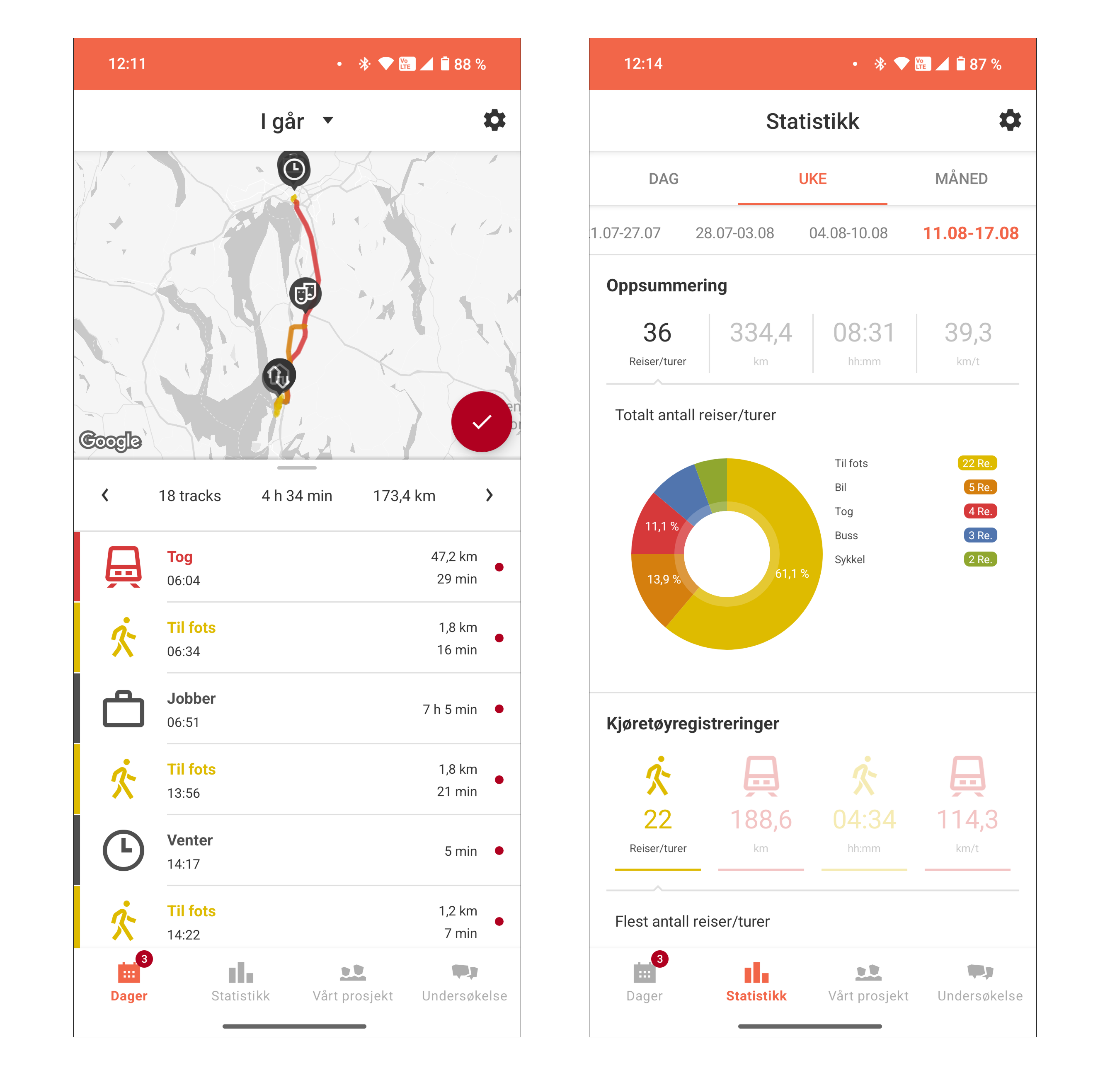 For å ta i bruk appen må du laste den ned, åpen den og følge instruks om hvordan du gir appen nødvendige tillatelser som trengs for å registrere dine reiser. Du kan deretter bruke appen når som helst for å sjekke reisene dine. Her kan også godkjenne eller korrigere hvis appen tar feil.